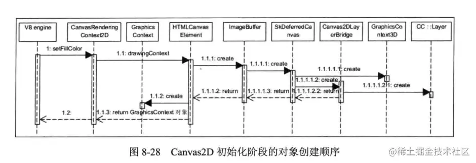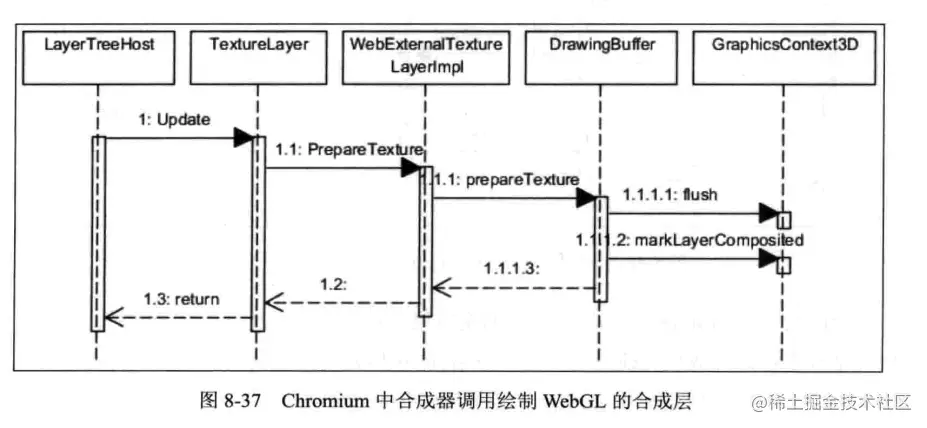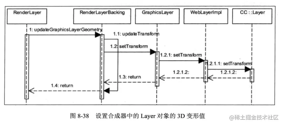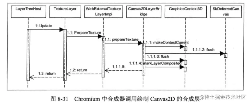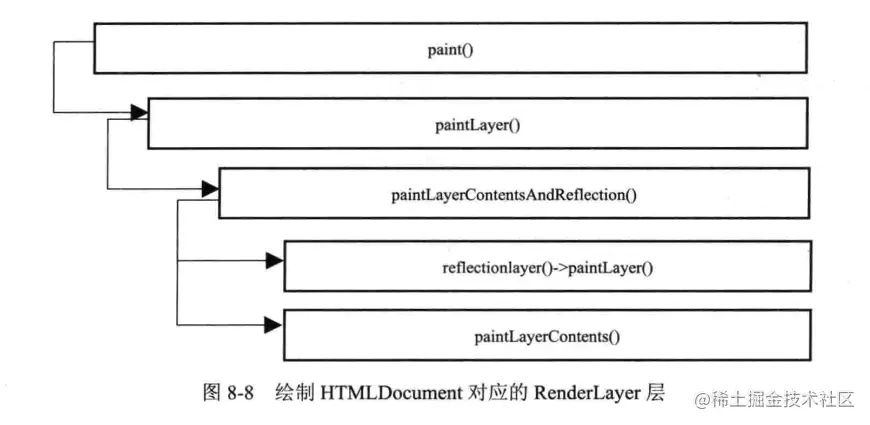 webkit绘制该节点所在合成层,需要遍历两个RenderLayer对象所包含的子树,与其他绘制的内容的调用过程非常相似。该合成层也需要一个用于2D图形的图形上下文对象。该对象的内部实现有各个一直来决定。该层的调用过程如图8-8所示,与软件渲染非常类似,只是递归过程稍微不同。