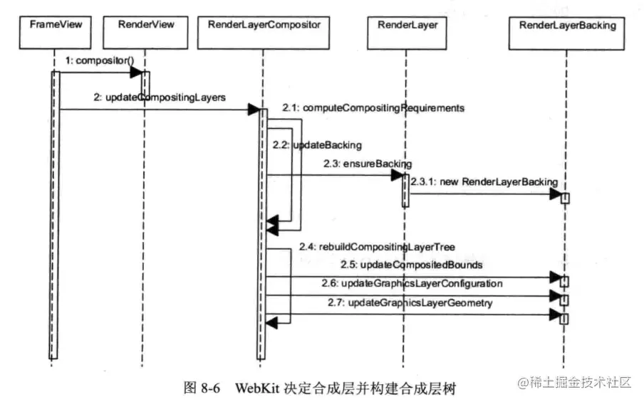 首先看webkit是如何确定并计算合成层的。 图8-6描述了webkit如何决定哪些是合成层并为他们分配后端存储的过程。