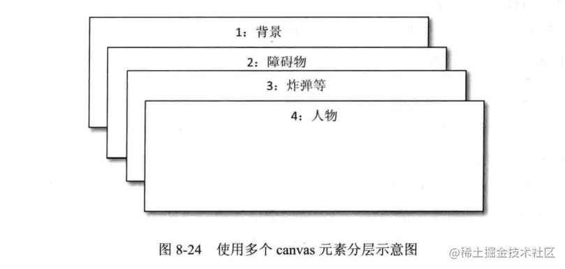 比较好的做法是,使用多个canvas元素,按照前后顺序叠放,前面的元素背景透明。以前面的游戏为例,我们可以使用第一个canvas绘制背景,第二个canvas绘制障碍物,第三个canvas绘制金币等奖励,第四个canvas绘制人物。人物不动时,如果障碍物和金币在变化,只需绘制第二三个元素;如果人物走动,只需绘制第四个元素。第一个元素很少会被重新绘制,这样做有效减小开销。图8-24描述了这一概念。