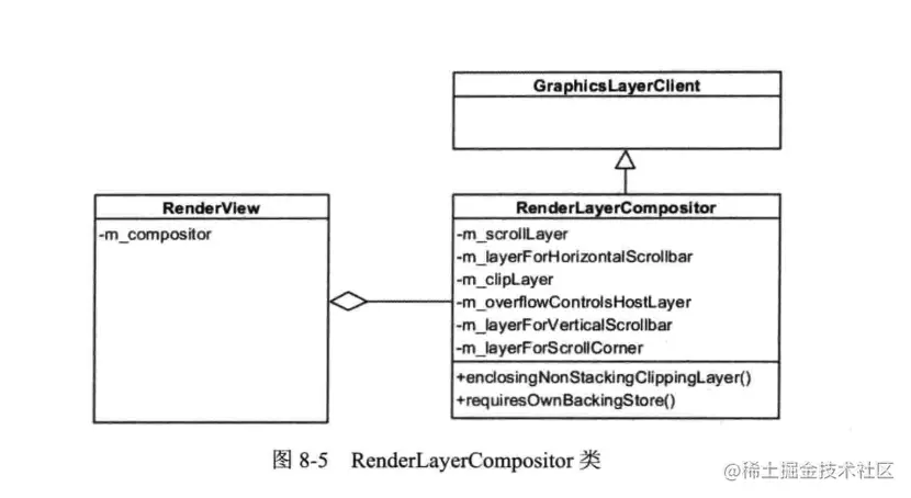 管理这些合成层等工作的是RenderLayerCompositor类,不仅计算和决定哪些RenderLayer对象是合成层,还有合成层创建GraphicsLayer对象,如图8-5.