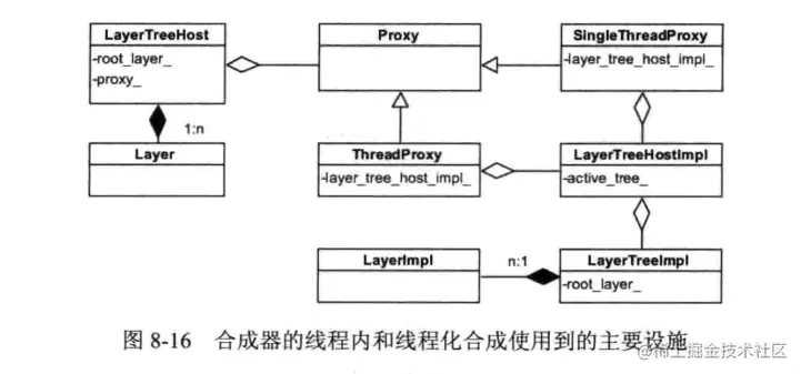 代理也很重要。代理是一个抽象类,定义了Layer树和LayerImpl树之间完成合成所需要的转接工作。它有两个子类,分别是SingnleThreadProxy类和ThreadProxy类,分别用于线程内合成和线程化合成两种情况。