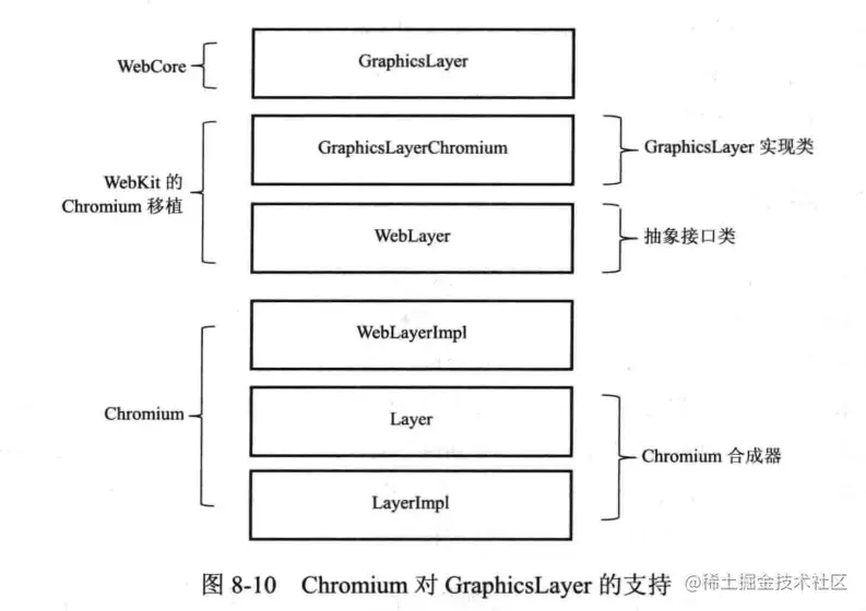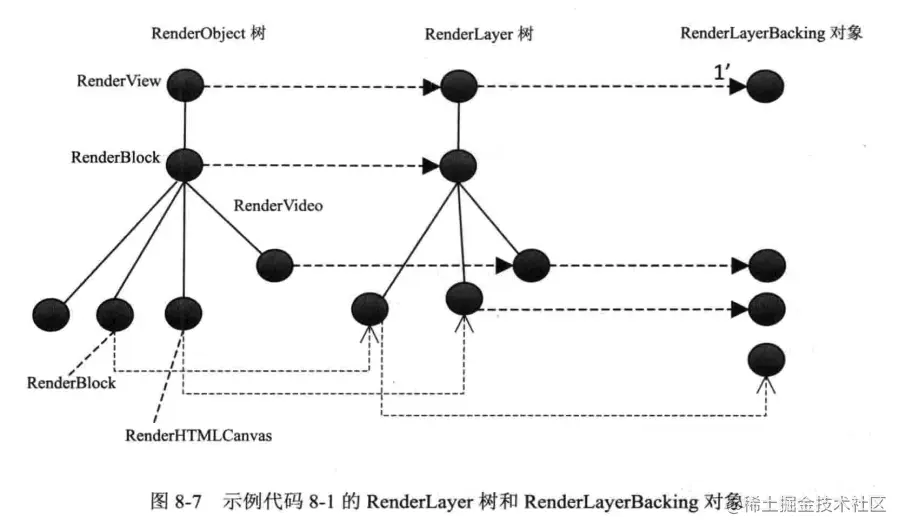 图8-7主要描述webkit为示例代码8-1建立的合成层以及对应的RenderLayerBacking对象。