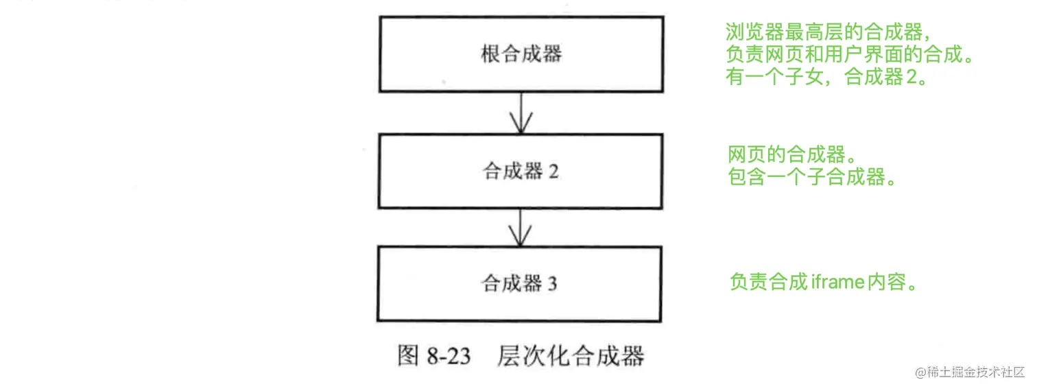 每个网页可能需要一个合成器,网页内的iframe也需要一个合成器,整个网页同用户界面的结合也需要一个合成器,这些合成器构成一个层次画的合成器结构,如图8-23所示。
