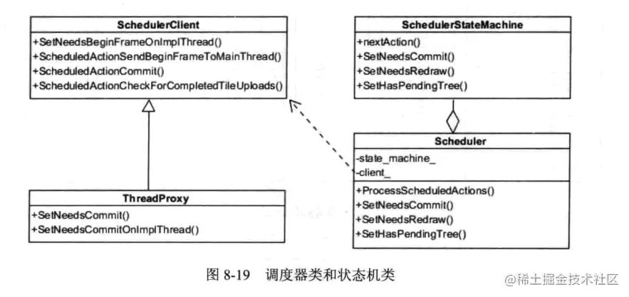 当调用Scheduler类的ProcessScheduledActions时,调度器会通过状态机来获取当前需要执行的任务,状态机根据之前设置的各种信息来决定下面的任务是什么。一旦确定了任务,调度器会通过SchedulerClient来执行实际的任务(ThreadProxy就是SchedulerClient的一个子类,可以桥接到Layer树、LayerImpl树或其他设施。 )。