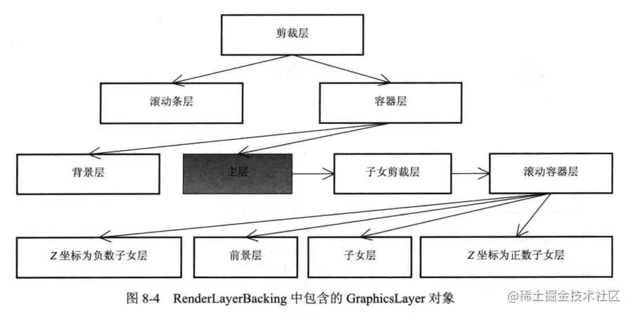 图8-3描述了一个RenderLayerBacking对象可能包括众多的GraphicsLayer,它们表示不同的含义。