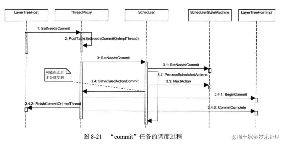 下面以同步Layer树到LayerImpl树(commit)为例说明任务的调度过程以及调度器在这一过程中起到的作用。图8-21描述了commit任务的调度过程。