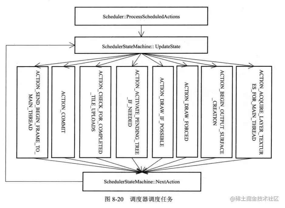 调度器Scheduler的基本原则是一切请求都是设置状态机中的状态。调度任务的主要函数是ProcessScheduledActions,它的工作方式如图8-20所示。
