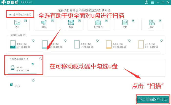 - 安装软件,将U盘与所安装软件的电脑进行连接,进入软件,对要恢复的文件类型和u盘盘符做相应的选择,点击 【扫描】 ;