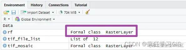 接下来,我们需要为栅格遥感影像的拼接做准备——也就是for循环内部的内容。此时,tif_file_name变量中存放的是指定文件夹下的全部栅格遥感影像的文件名称,而不是遥感影像文件自身;而接下来我们进行拼接、融合的函数,都需要保证函数参数中的遥感影像是一个栅格对象(Raster* object)类型的变量。因此,我们需要在这个for循环中,通过raster()函数,将每一个遥感影像的文件名(字符串类型)转为栅格对象类型。至于什么是栅格对象类型的变量,我们可以参考下图:其中Formal class RasterLayer即表示这一变量为栅格对象类型的。