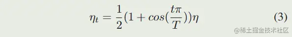 4. 学习率调度器:常用的由余弦学习率调度器和指数型学习率调度器,其中指数型学习率调度器是在每次迭代(一个epoch)的时候把学习率乘0.95;余弦学习率调度器的公式如下: