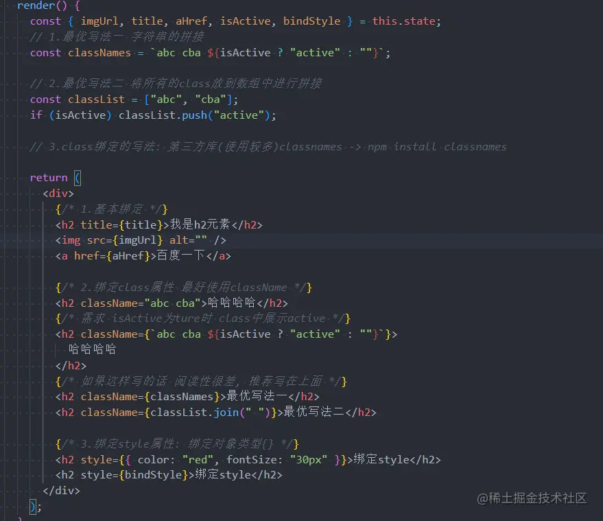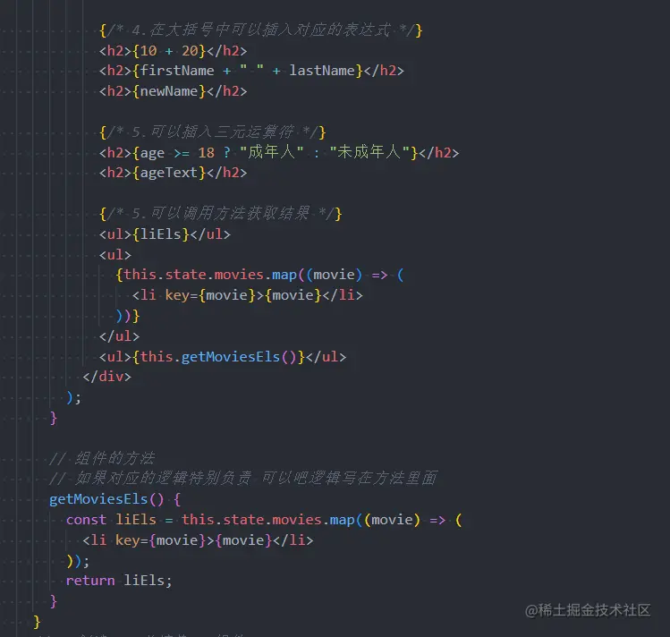- 但是React中的JSX正是因为和JavaScript无缝衔接,让它可以更加灵活