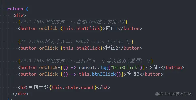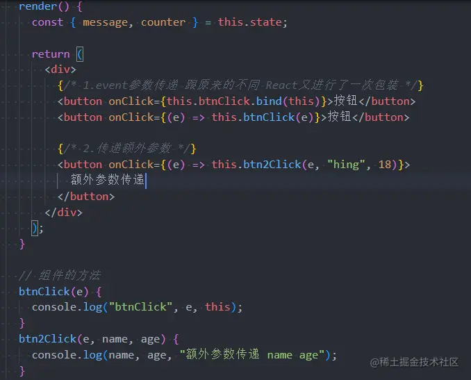 - btnClick函数并不是我们主动调用的,而是当button发生改变时,React内部调用了btnClick函数