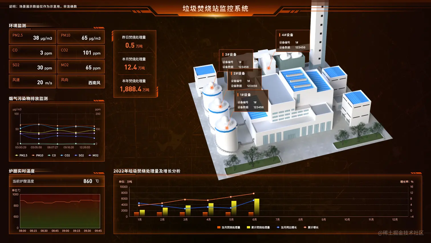 基于可视化在线平台,本示例为垃圾焚烧设备、发电设备、建筑构建三维模型,2D 面板联动三维场景,以图表形式帮助运营管理人员实时监测参数,运用 2D 组态展示工艺流程,协助远程自动控制及发现运行过程中的问题,以满足不同管理人员的业务需求。