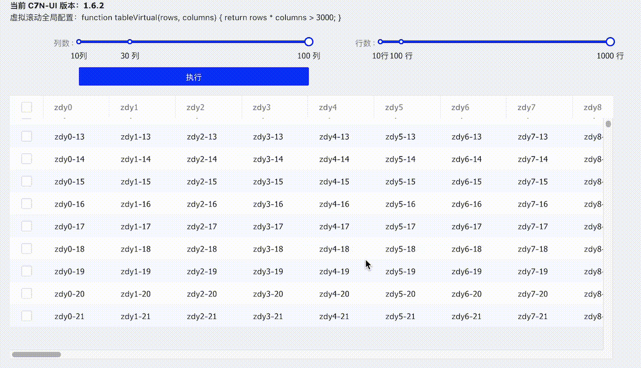优化后只需在 Table 上配置 virtual属性即可开启双向虚拟滚动; columnBuffer和 columnThreshold属性可根据表格复杂度来配置(两个属性默认值均为 3,满足绝大部分场景的滚动效果,一般不用配置)。
