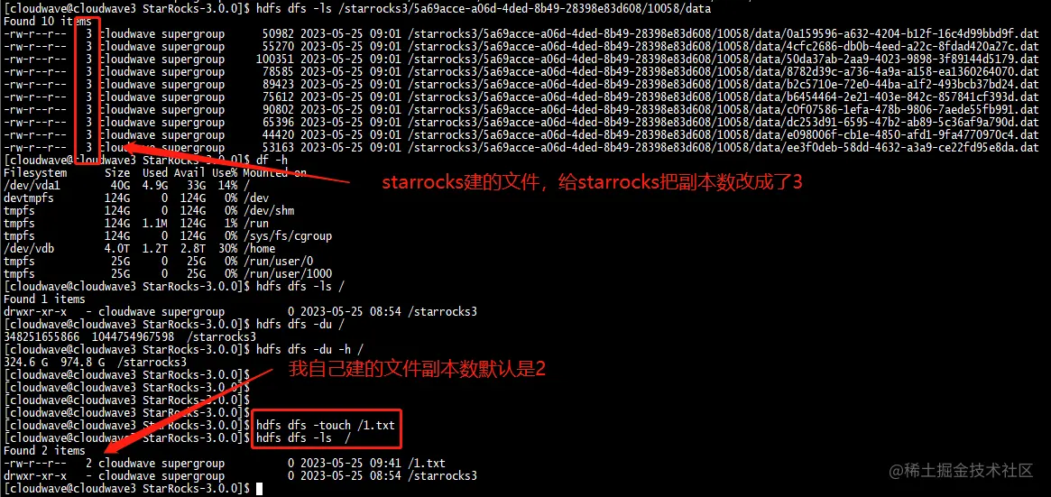 - 如上图所示,导入过程中,发现在我设置的hdfs副本数默认=2的配置下,starrocks自己把自己建的文件副本数改成了3。