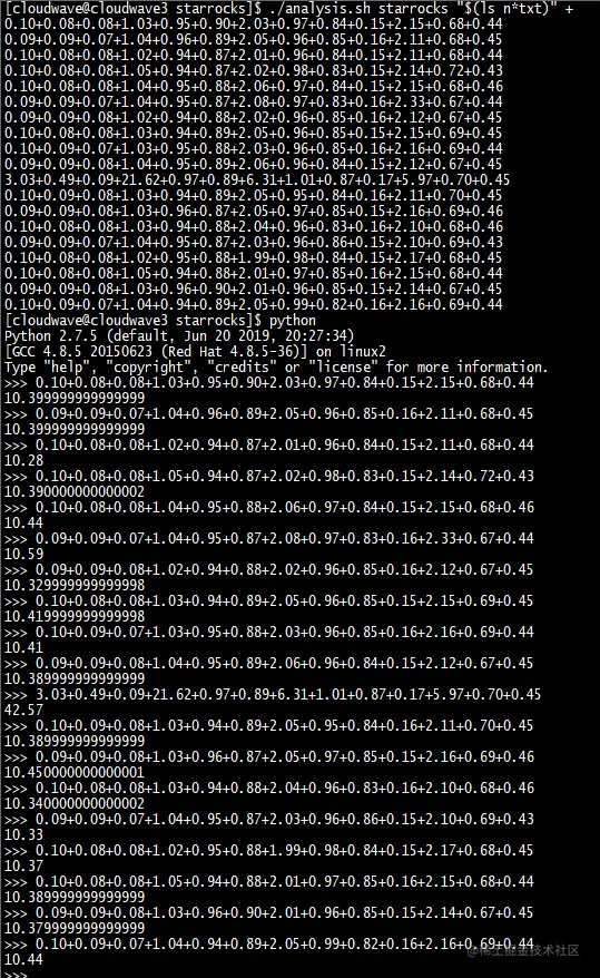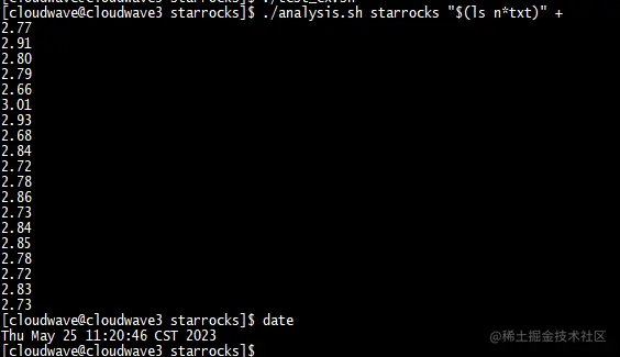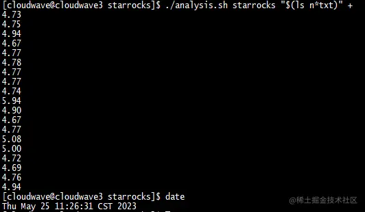 - 执行分析脚本./analysis.sh starrocks "$(ls n*txt)" +,去掉第一轮查询(42.57s)的平均时间是10.39秒