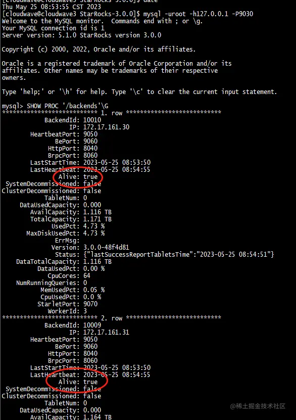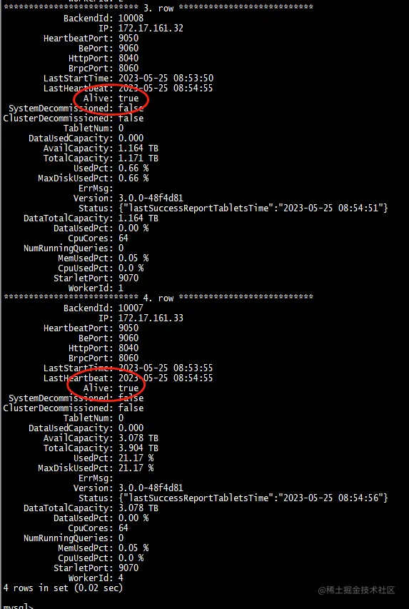 5. [starrocks] 验证集群状态,4个节点的 Alive=true 即可。