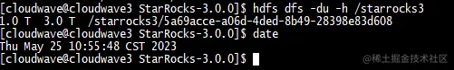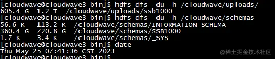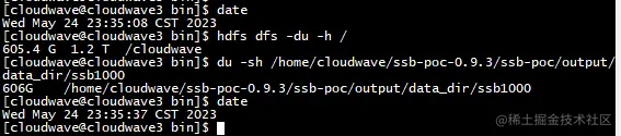 - 上图通过hdfs命令,可以看到cloudwave做了数据压缩,ssb1000数据的原始大小是606G,导入cloudwave数据库之后,压缩到了360g(图中的720G 表示hdfs两个数据副本的总大小),压缩比为59%。