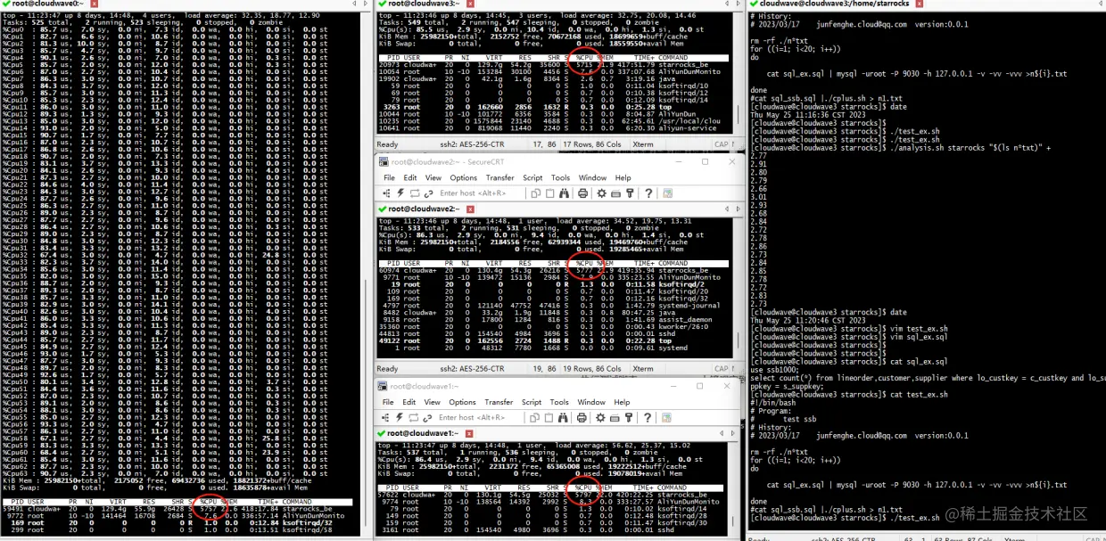 ./test_ssb.sh,七镜观察到cloudwave 的4节点集群测ssb1000 CPU最大占用是90%(5763%/6400%)