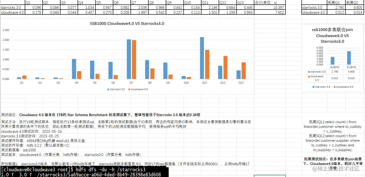 评测结论1:4台64核256g阿里云服务器组成的4节点集群,hadoop3.2.2 作为分布式存储,Cloudwave4.0在 SSB1000g 国际标准测试集下,整体性能优于Starrocks3.0近0.36倍。