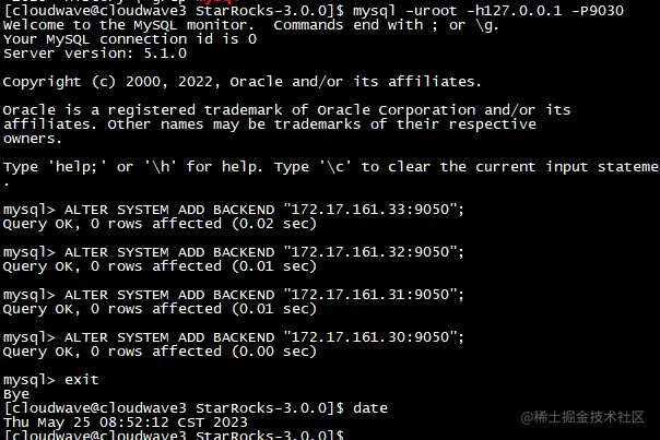 ALTER SYSTEM ADD BACKEND "172.17.161.33:9050";