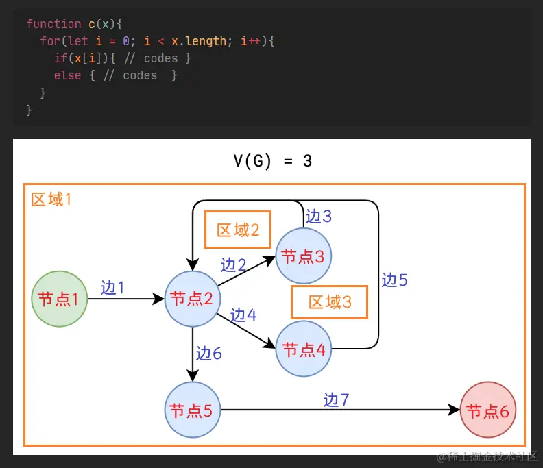 套用公式二:可以看到有三个区域,一个最外围的区域,两个封闭的区域,所以 也就是圈复杂度为 3