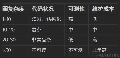 我们认为圈复杂度控制在 1~10,这个代码的质量是非常高的,如果说很难控制的话,尽量也不要超过 20,超过 20 的话就很难维护了。