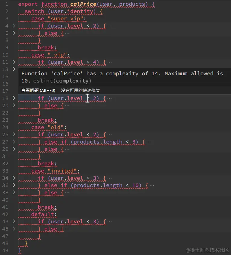 可以看到,这段代码比较复杂有很多的分支,并且看到它报错了,将鼠标放上去看到这是一个 eslint 的错误,它的规则叫 complexity,也就是复杂度。