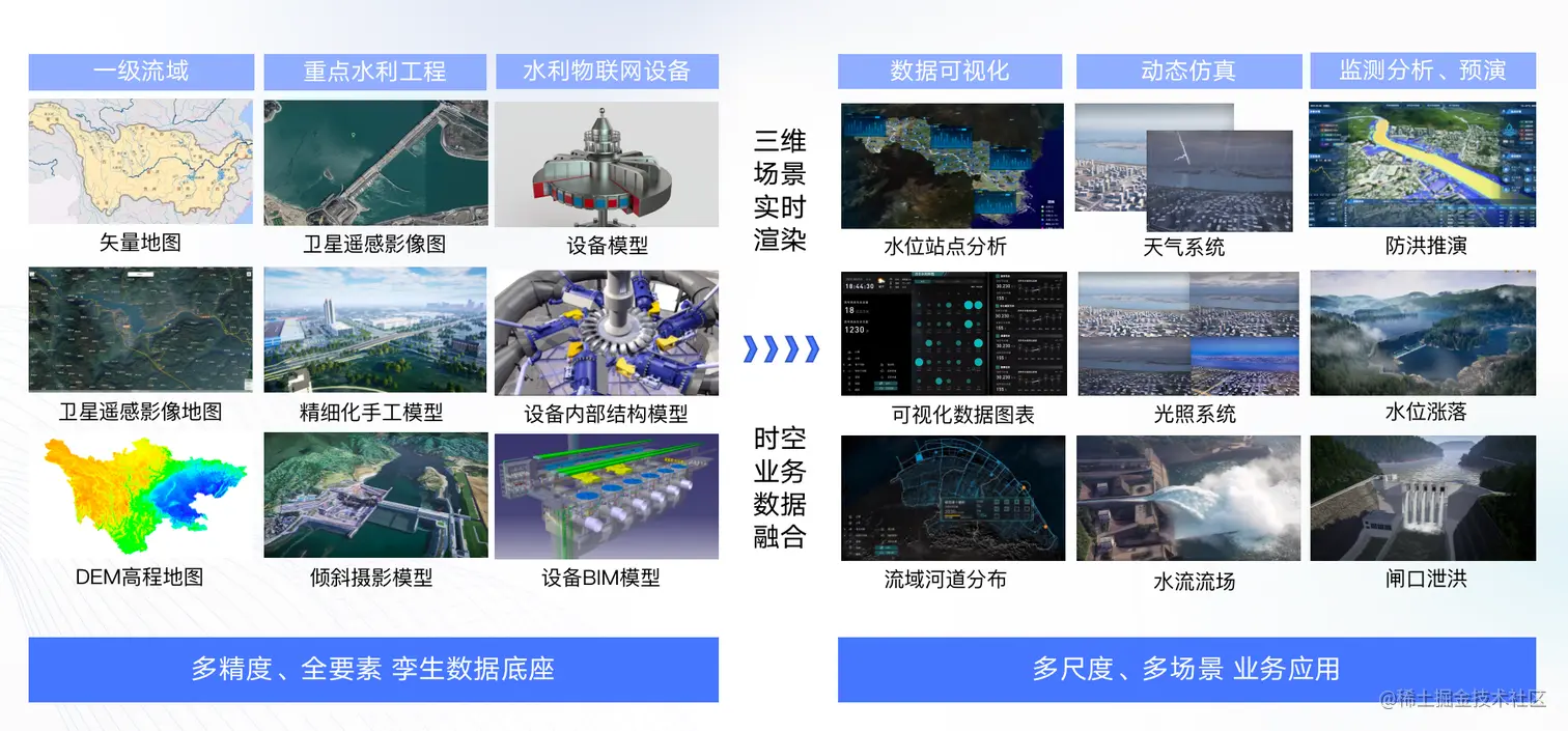 在数字孪生水利解决方案中,数据底板的建设是关键一步。宏观尺度上,需要关注整个流域的全局信息,以“水利一张图”为基础,包括矢量地图数据、卫星遥感影像地图和DEM高程地图数据等。中观尺度上,主要关注重点水利工程所在的某一河段或库区的信息,包括卫星遥感影像图、精细化手工模型数据、倾斜摄影模型数据和高精度DEM数据等。微观尺度上,关注具体的水利工程和设备层面,如水利物联网设备和水库大坝,通过GIS、BIM和物联网技术,实现设备模型的建立和细节展示。