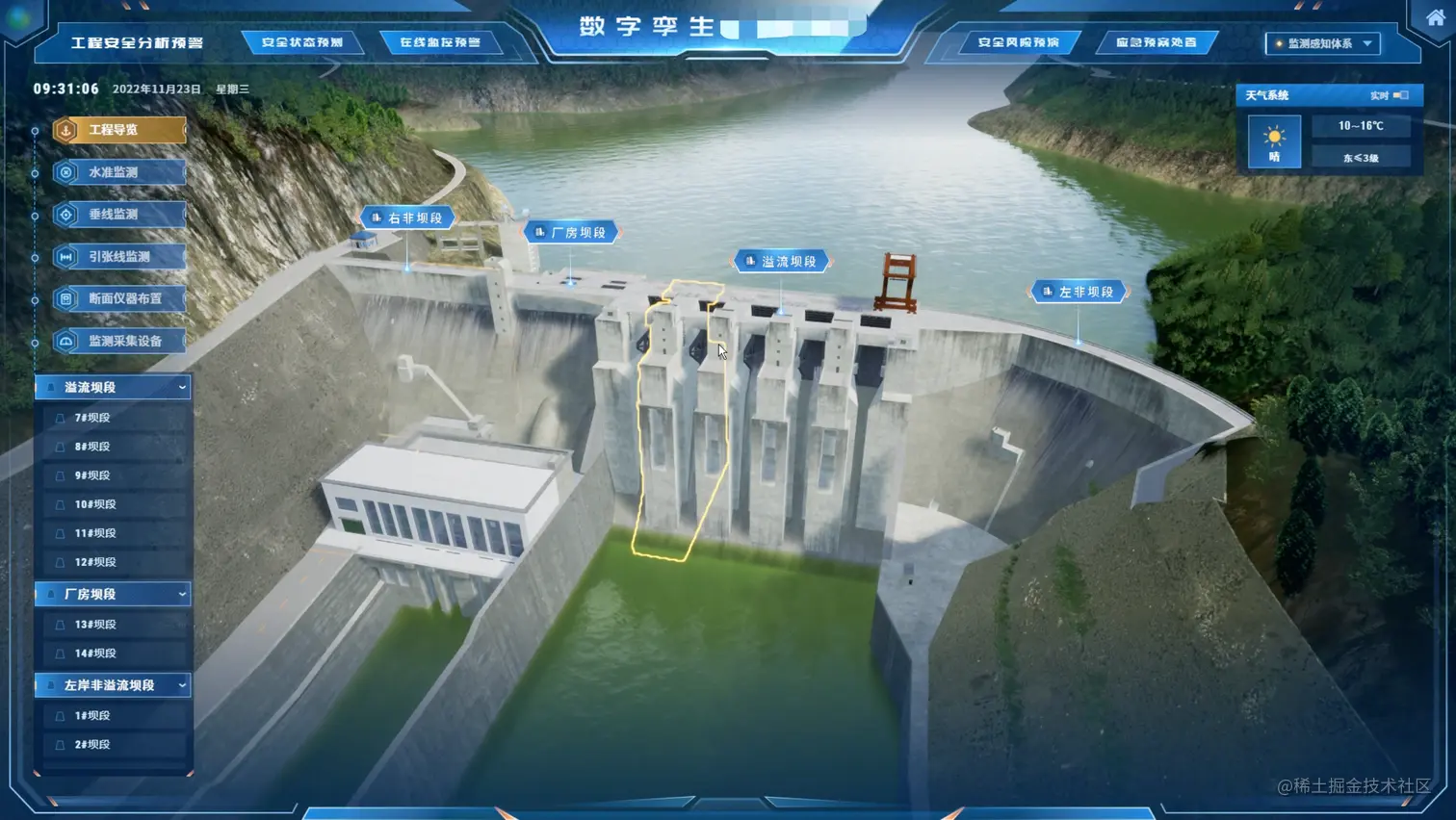 数字孪生水利工程的感知体系是实现对工程安全状态监控和预警的重要手段。感知体系主要包括变形监测、渗流监测、应力应变及温度监测、环境量监测以及其他专项监测内容。通过物联网技术和传感器设备,实时获取工程监测数据,并将数据汇聚到数字孪生平台的数据底板中,以便实时分析和处理。