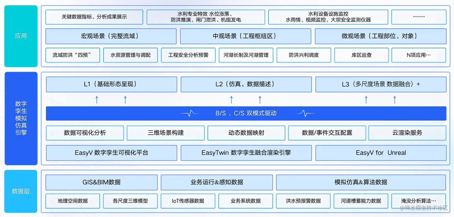 易知微基于EasyV数字孪生可视化平台、EasyTwin数字孪生融合渲染引擎和EasyV for Unreal数字孪生游戏引擎驱动器为核心,接入数字孪生水利底层GIS与BIM数据、业务运行与物联感知数据、模拟仿真与算法数据,**依托数字孪生建模与场景渲染能力,打造B/S与C/S双模式驱动的数字孪生水利应用,****覆盖宏观数字孪生流域、中观工程枢纽区和微观水利工程设备三大应用场景,**具体包括流域防洪“四预”、水资源管理与调配、水利工程安全分析预警、河湖长制及河湖管理、防洪兴利调度、库区巡查等。