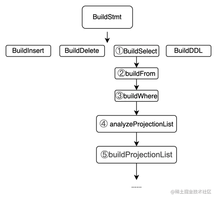 buildStmt() -> buildSelectStmtWithoutParent() -> buildSelectClause()