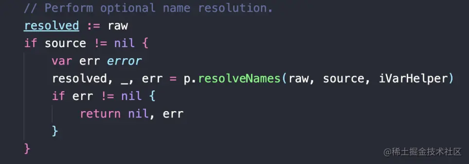 参数 sources 和 IndexedVars,如果都不是 nil,则表示 resolveNames 应该被执行。IndexedVars map 将被填充并且作为结果返回。