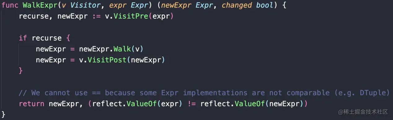 Normalize 的实现主要依靠 WalkExpr 函数。WalkExpr 会横穿 Expr,其通过传入对应的 visitor 来定义 WalkExpr 的具体行为,前面讲到的 name resolution 也是通过传入 name resolution visitor 实现的。