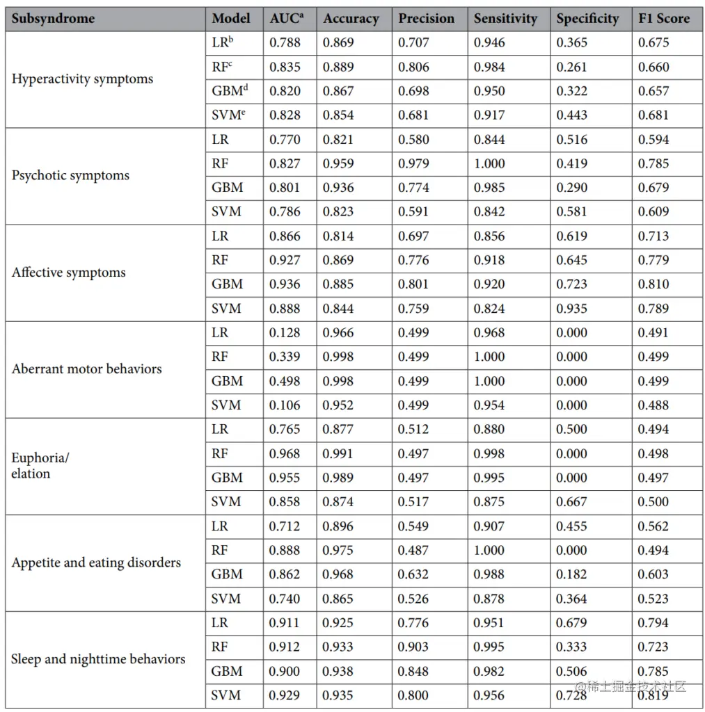 综合两图表信息,研究人员发现在预测 7 个亚综合征方面,梯度提升机模型平均 AUC 值最高,即表现最佳。 与此同时,研究人员也提醒,在测试数据集的样本量较小情况下,需要谨慎推断预测性能的结果,并建议未来应进行更大样本量的重复实验以获得更准确的预测结果。