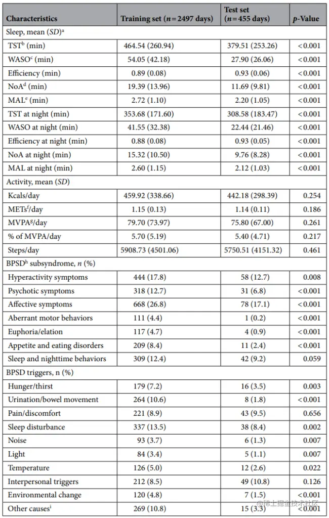 为了对参与者进行全面的特征信息收集,研究人员首先调查了他们的健康数据(年龄、性别、婚姻状况等)和发病前的性格类型(韩国五大人格量表 BFI-K), 其次使用身体活动记录仪监测夜间睡眠和活动水平,最后又采用了一种症状日记 (symptom diary) 来记录照料者感知到的症状的触发因素 (饥饿/口渴、排尿/排便、疼痛、失眠、噪音等) 以及患者每天发生的 12 种 BPSD。此外,这些症状也被划分为 7 个亚综合症, 下图直观展示了身体活动记录仪和症状日记数据的记录情况。