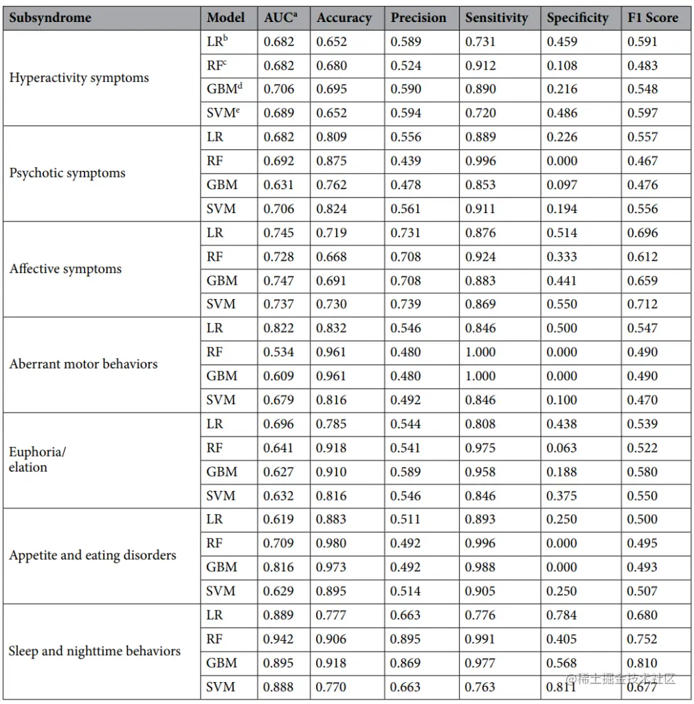 表 2:基于训练集,不同模型预测 BPSD 亚综合症性能