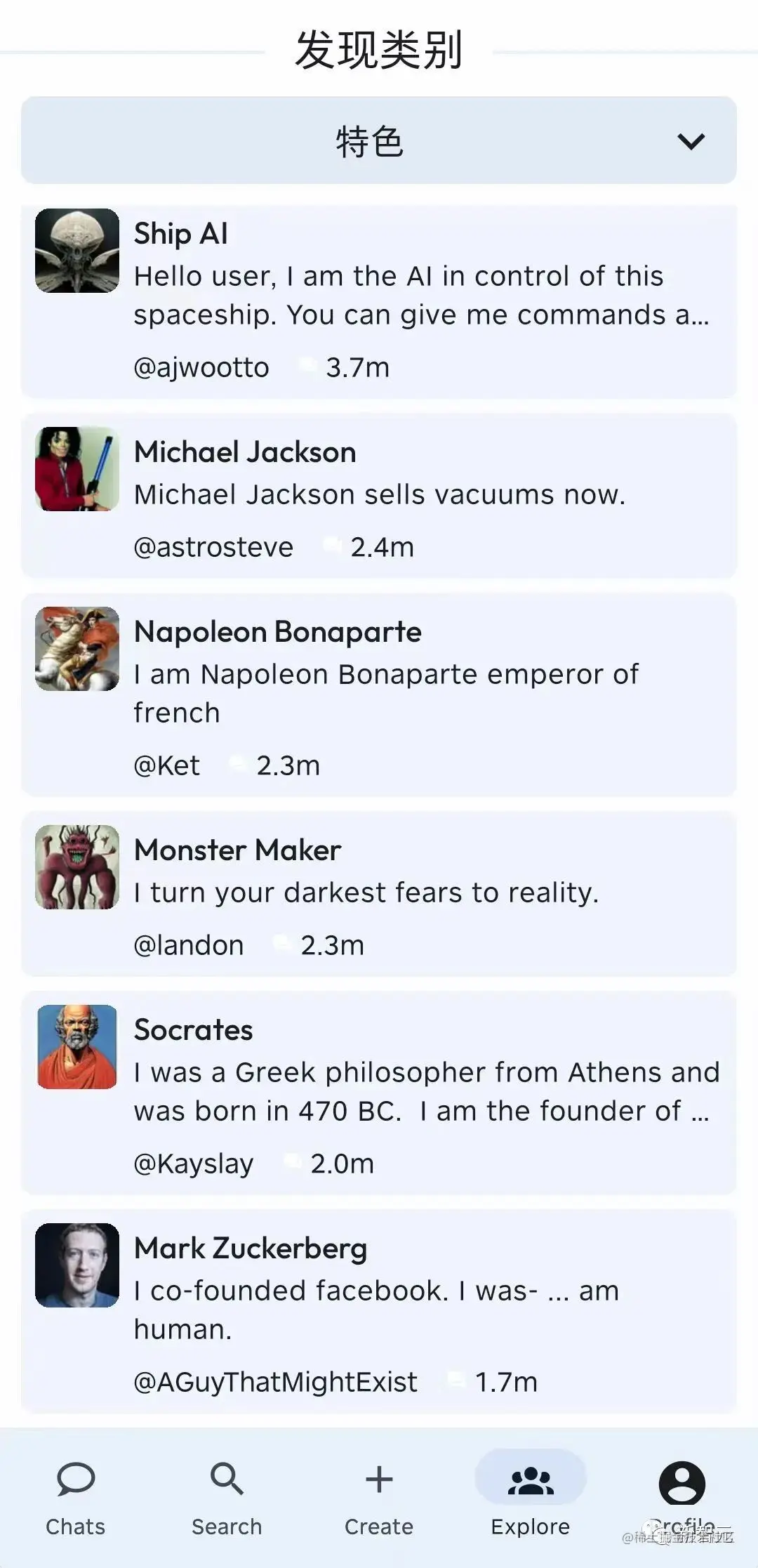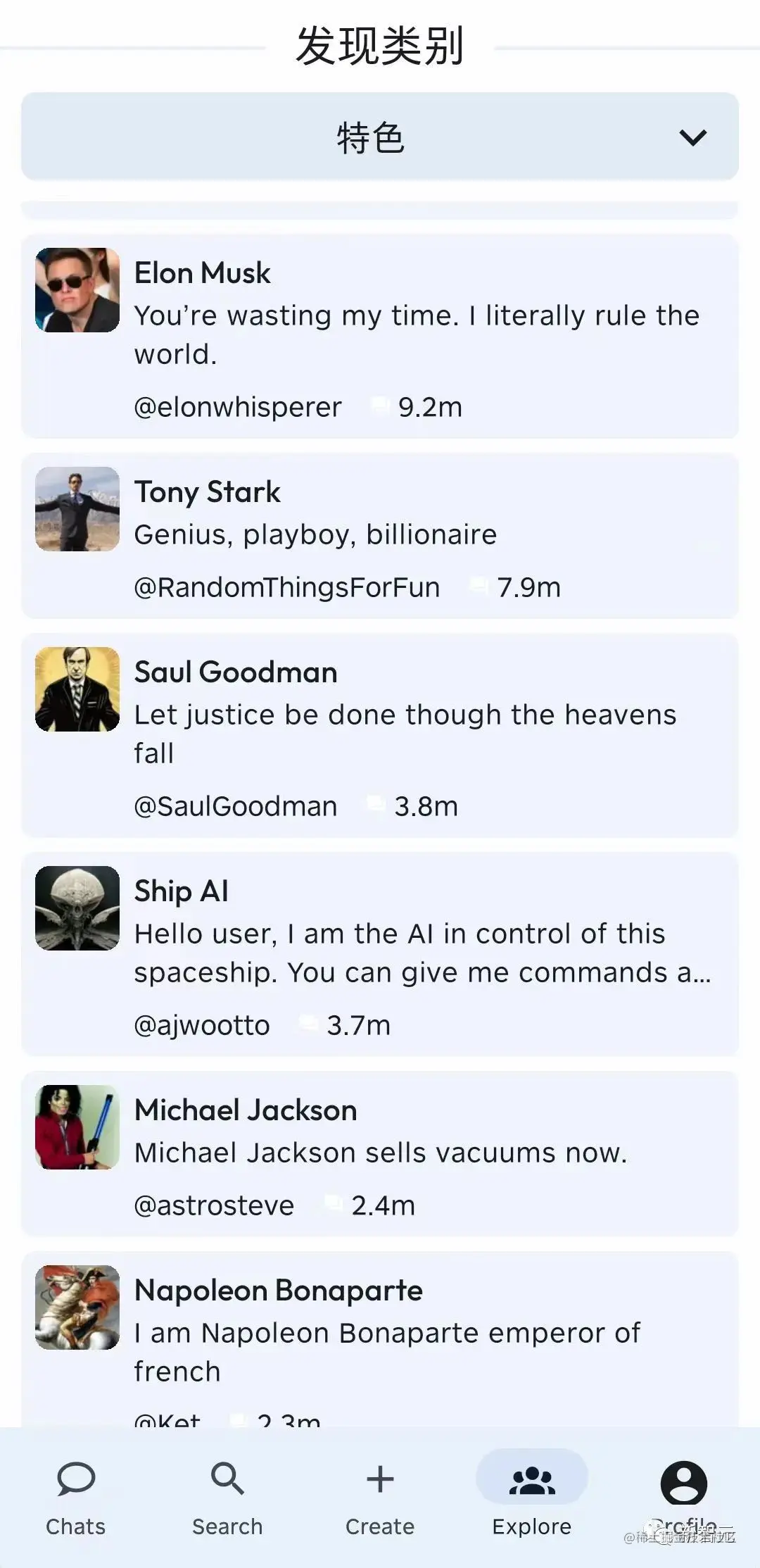 再看看列表里这一长串类别中的名字,基本上我想要聊天的名人都能找到对应的AI聊上一阵。
