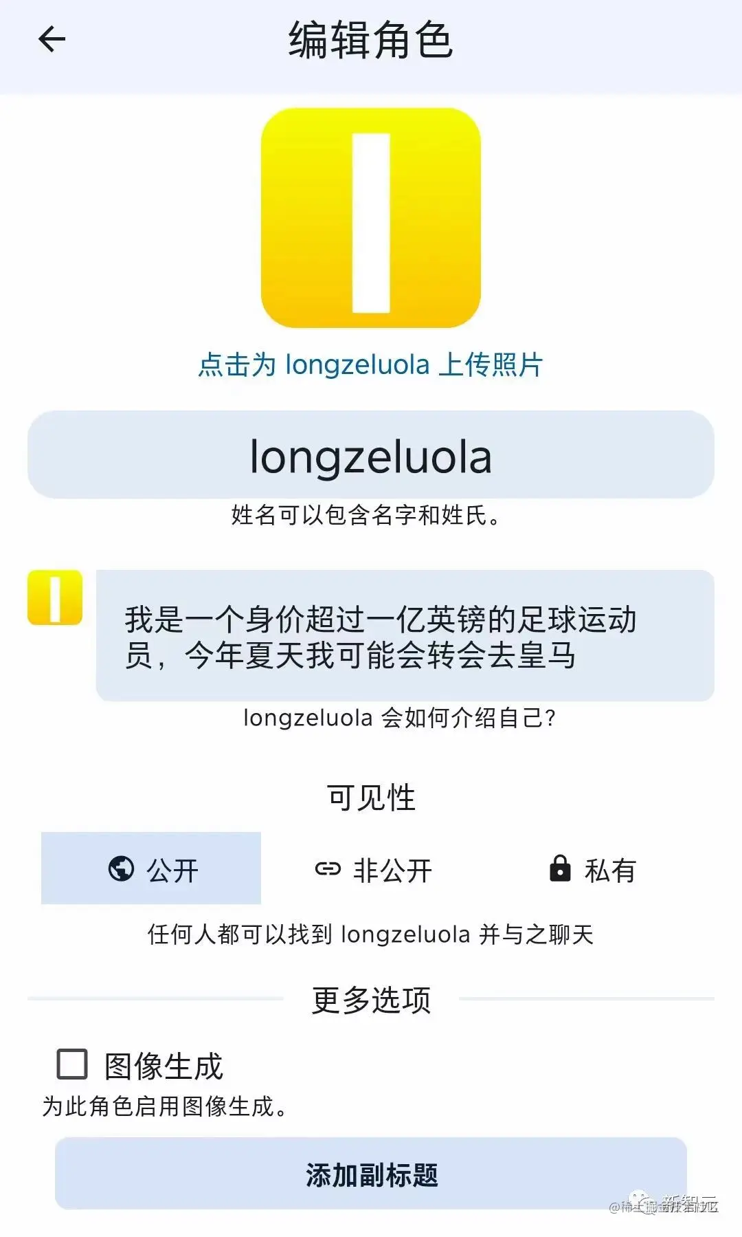 第一个角色非常简单,介绍里我就添加了一条招呼语,一个即将加盟皇马的足球运动员AI就生成了。