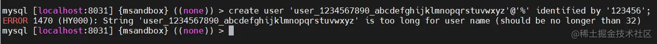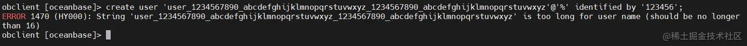 创建用户时,用户名长度超出限制,MySQL 和 OceanBase 的报错一致,提示 too long for user name。