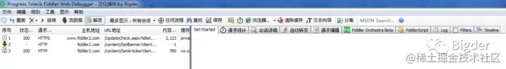 4.重启Fiddler,菜单栏常用功能菜单已经被汉化了,不错哦!!!