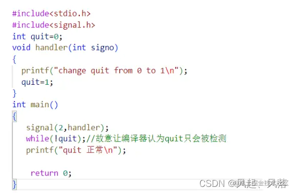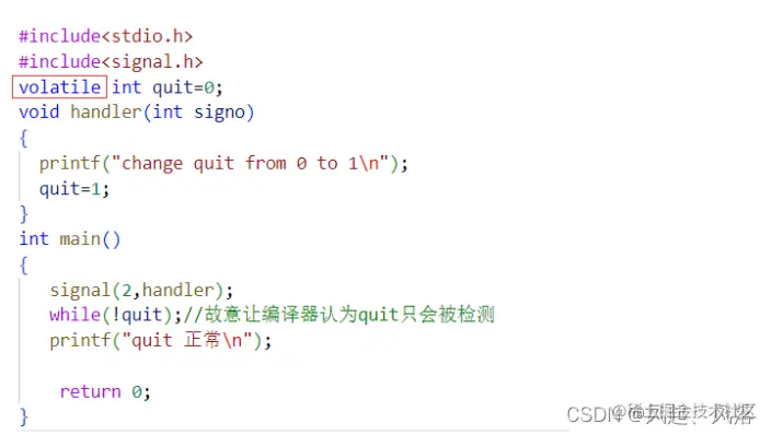 正常来说,每次都要尝试数据从内存load到CPU的过程 在main函数中 quit是没有被修改的,只是被检测,编译器发现quit变量没有被修改,就不会重复把数据从内存load到CPU中 因此编译器会优化,只需第一次把数据从内存load到CPU中,后续只需要检测寄存器中的数据即可