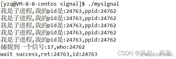 运行可执行程序后,who的pid值就是父进程的pid 17号信号就是SIGCHLD 同时通过waitpid返回的pid值与子进程的pid值相同