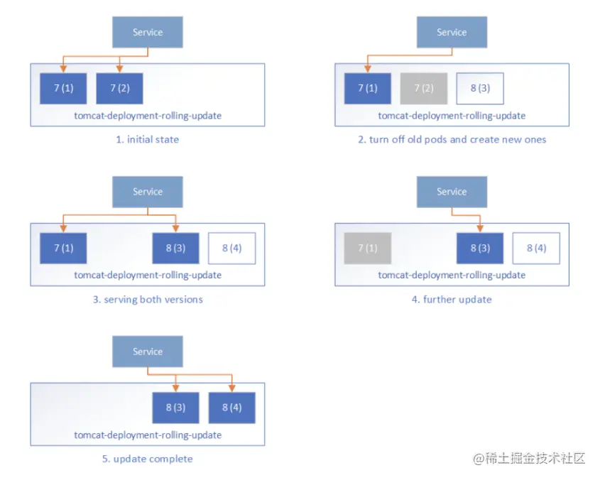 Kubernetes ⽀持 RollingUpdate 策略以逐渐⽤新的 pod 替换旧的 pod,同时继续为客户端提供服务而不会导致停机。要执⾏滚动更新部署: