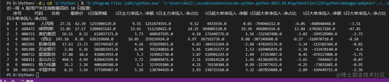 再测试一个例子:写一段Python代码,用AkShare库获取近一周A股用户关注指数最高的10只股票。
