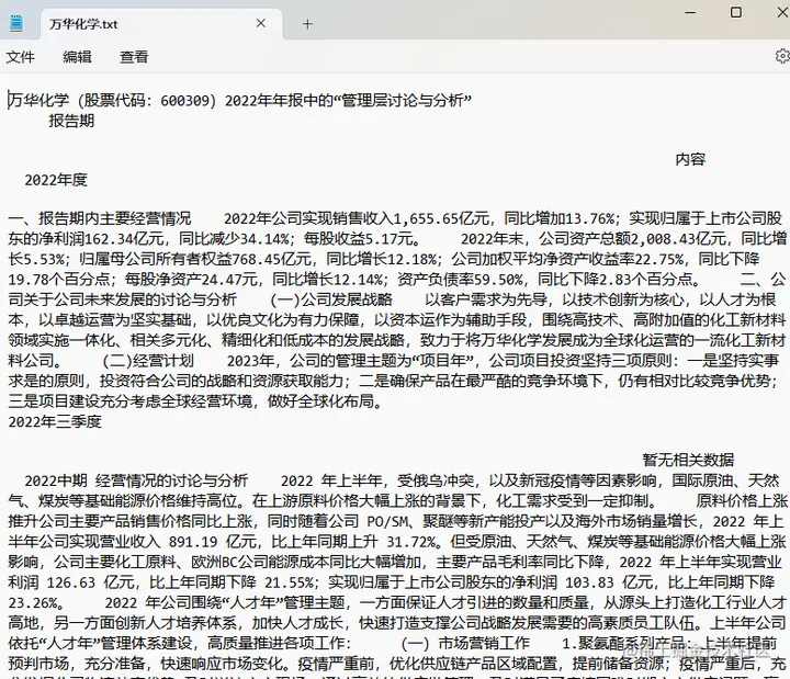 写一段Python代码,用AkShare库获取万华化学2022年年报中的“管理层讨论与分析”,然后保存到d盘的万华化学.txt