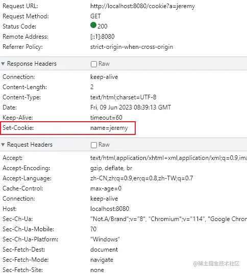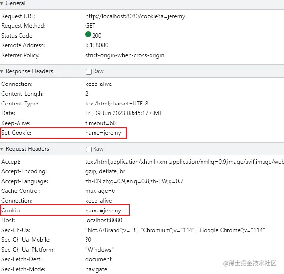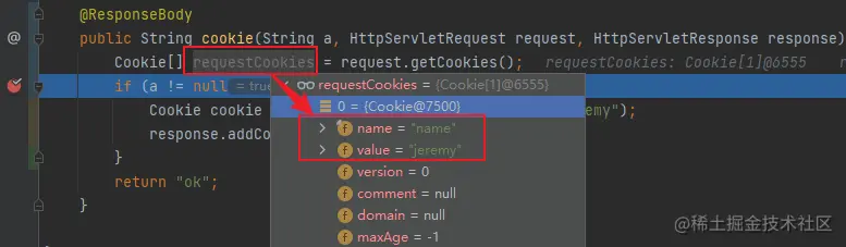 再次发送相同的请求http://localhost:8080/cookie?a=jeremy: