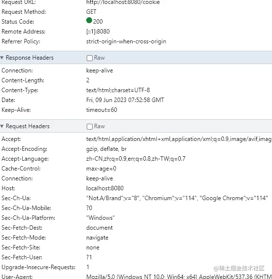 首先使用 Chrome 浏览器发送请求http://localhost:8080/cookie: