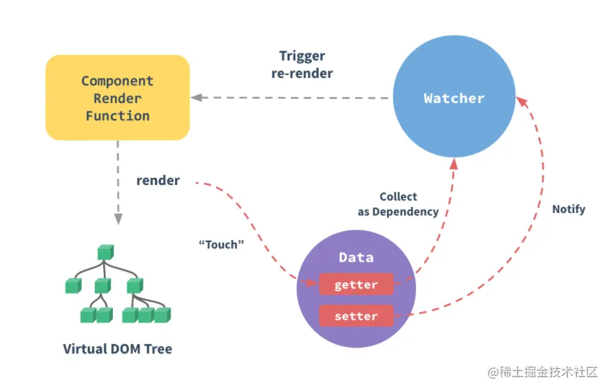 - 访问数据时(obj.key)进行依赖收集,在 dep 中存储相关的 watcher。