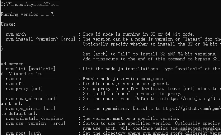 打开CMD,输入命令 nvm命令,安装成功则如下显示。